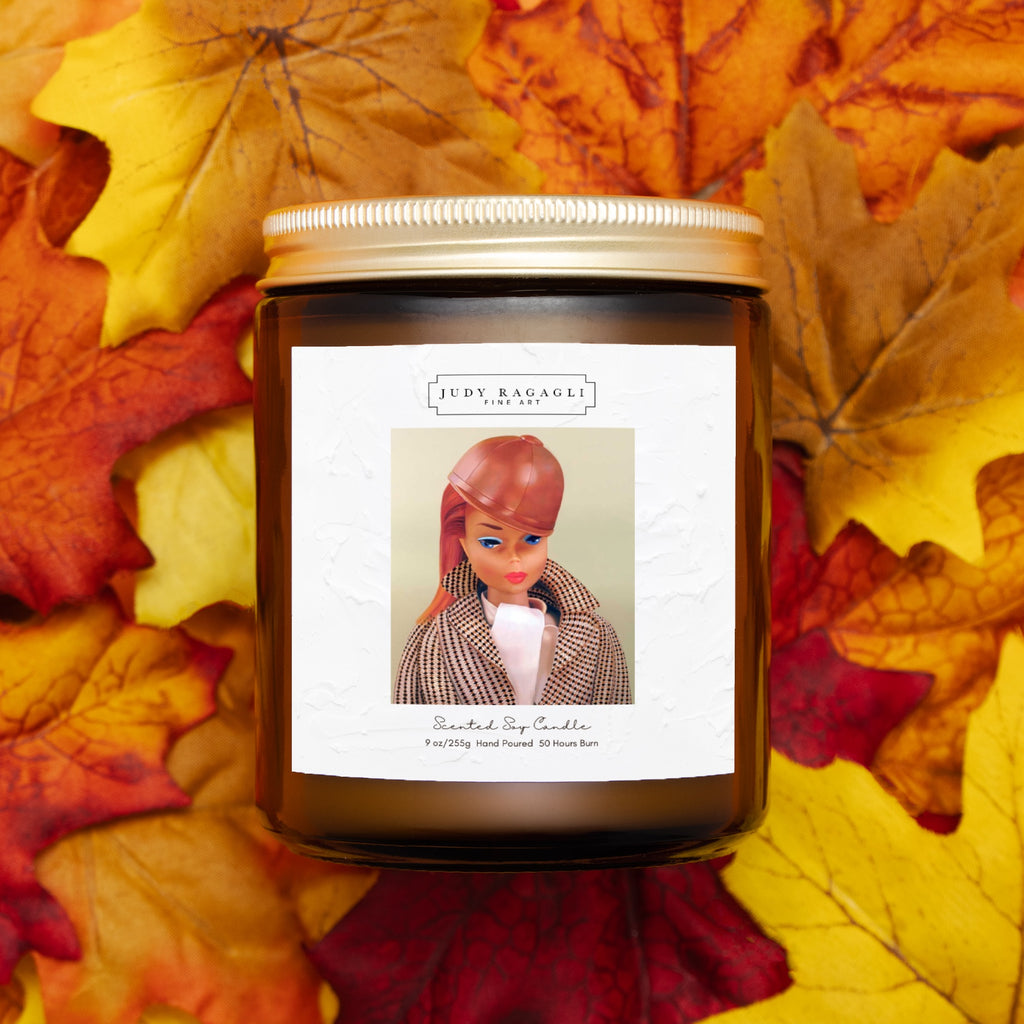 Introducing the "Riding in the Park Barbie" Candle Amber Jar 9 oz, featuring an original oil painting by Judy Ragagli. An exquisite addition to any space that beautifully merges nostalgia with modern elegance. This amber jar candle is not just a source of light; it’s a sensory journey. Available in 14 captivating scents ranging from Vanilla Bean to Fraser Fir, each candle fills your home with delightful aromas, perfect for birthdays, holidays, or any occasion. See scent descriptions below.